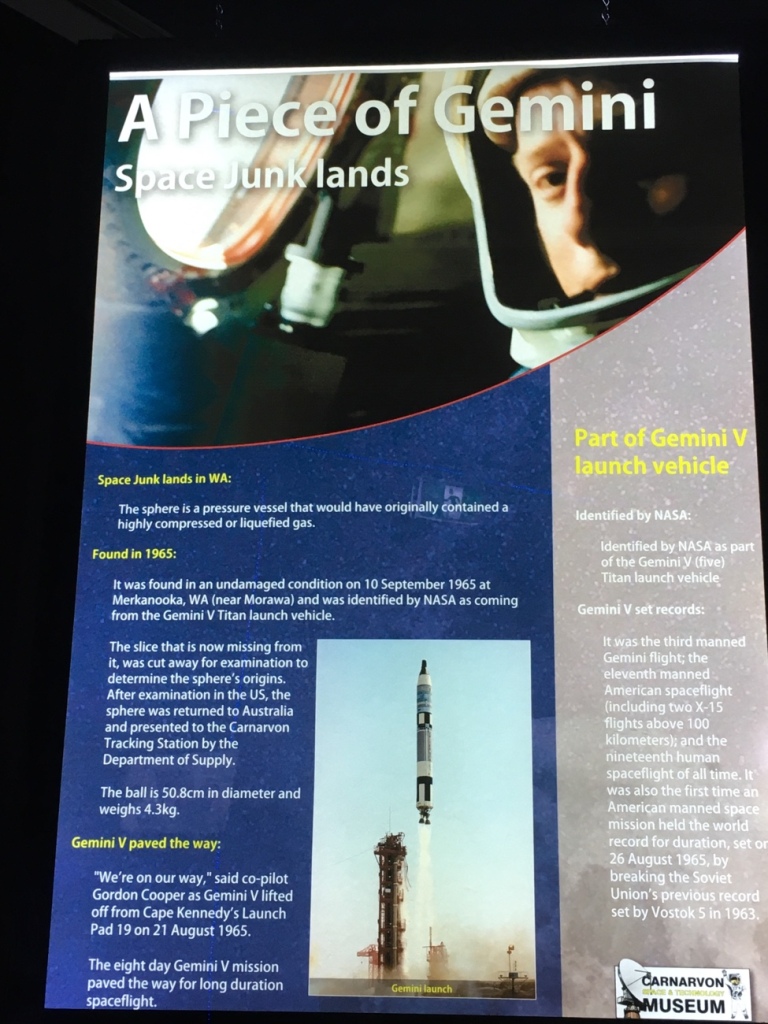 What a fantastic experience we had at the Space Museum in Carnarvon, Western Australia. We were attracted to it by the huge satellite dish visible from the highway but had no idea of the role Carnarvon played in early space missions, particularly the first moon landings.