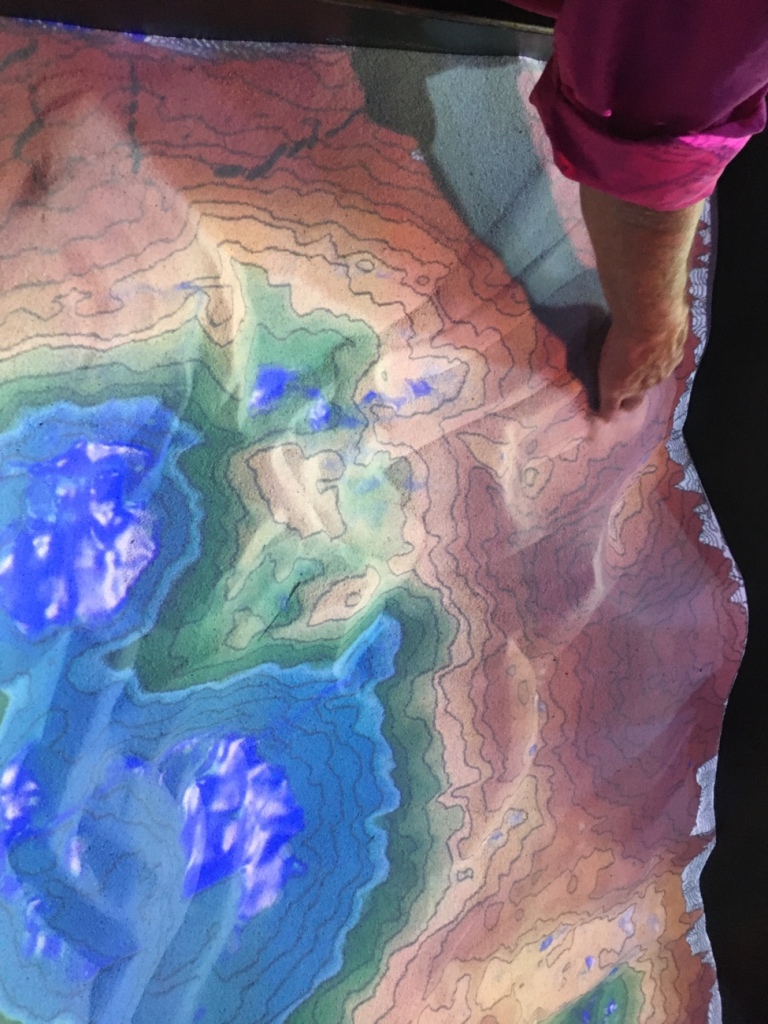 We played in the sand tray that changed the earth’s contours as we moved the sand around and made the rivers change course …